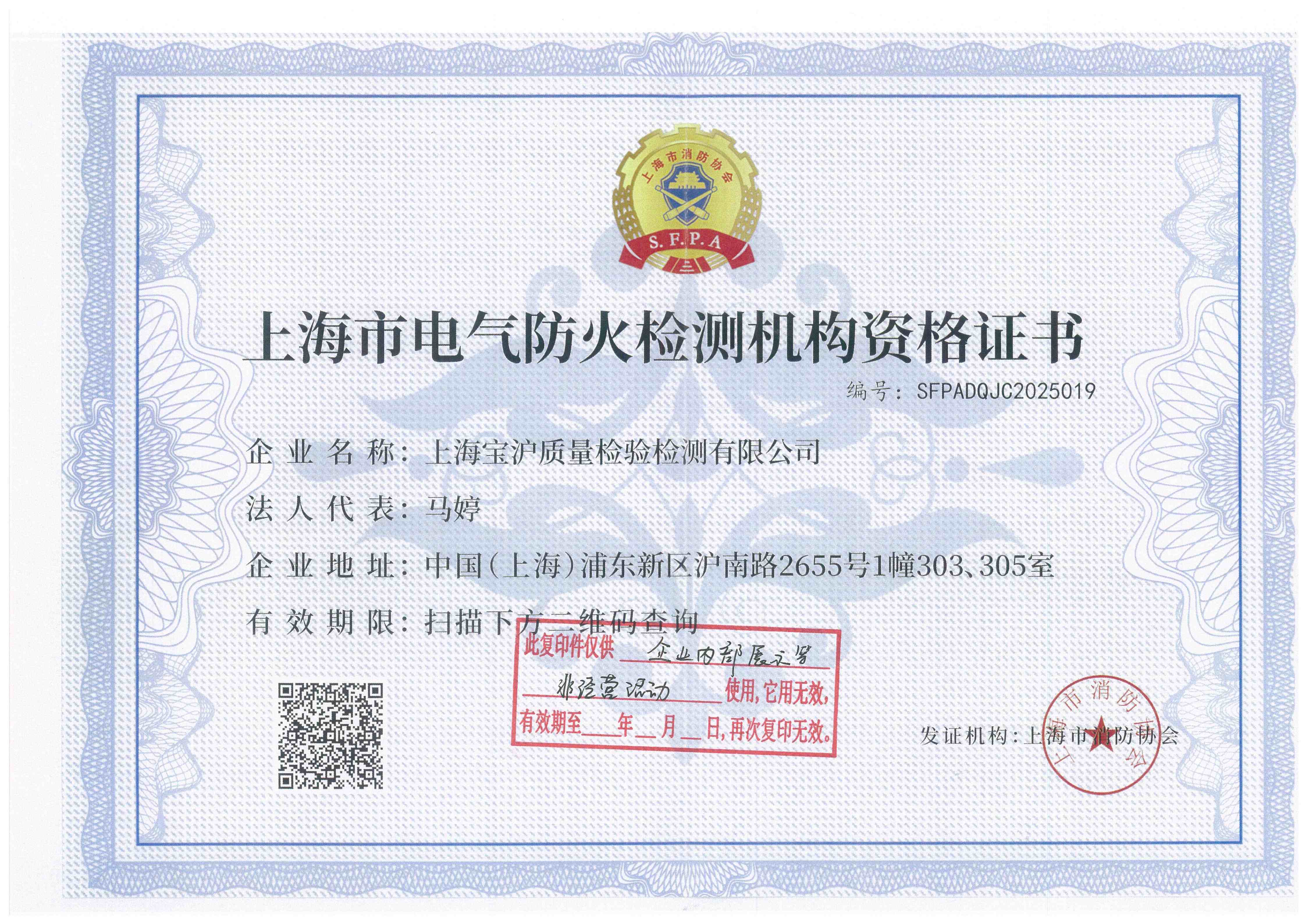 上海市电气防火检测机构资质证书
