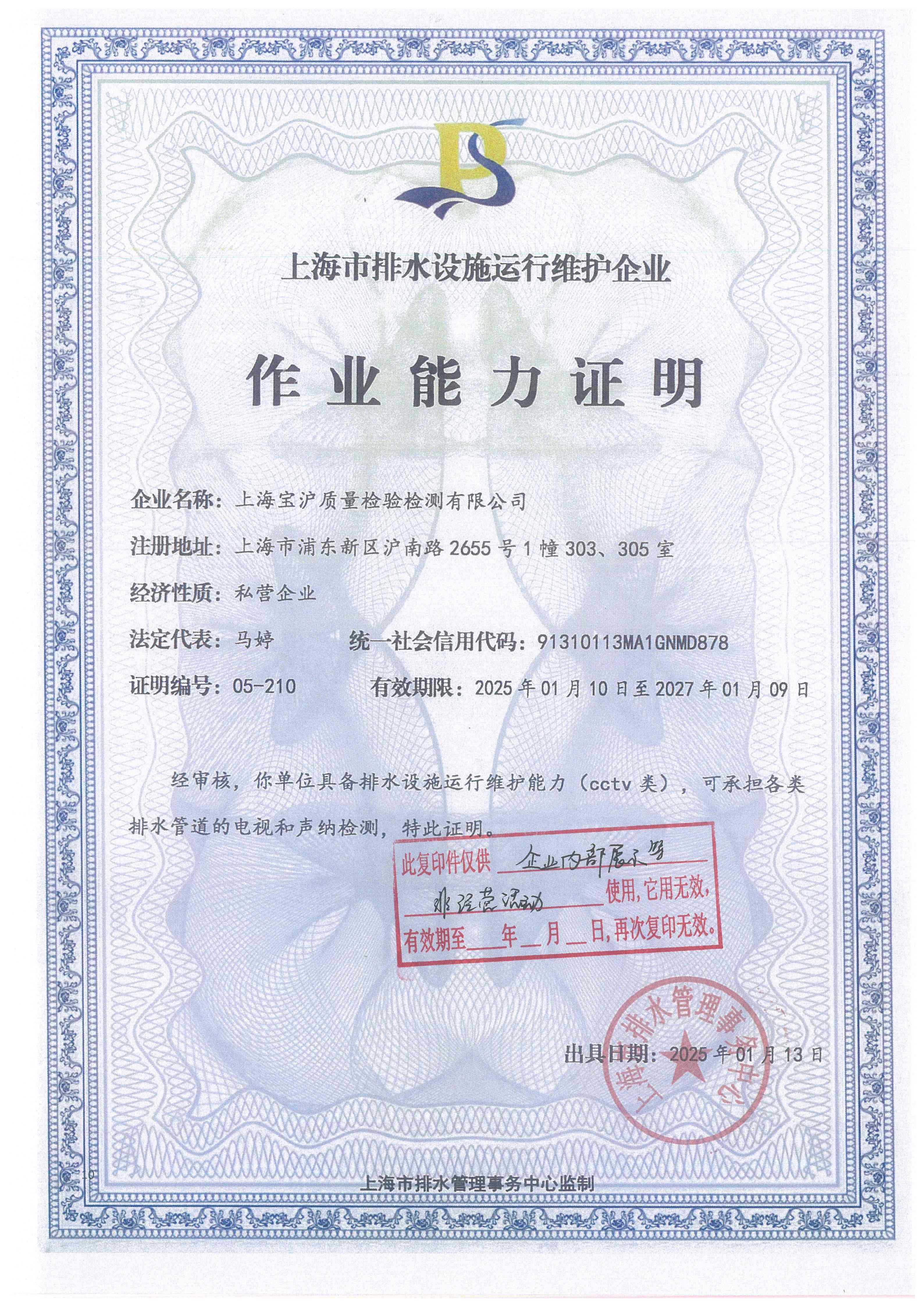 上海市排水设施运行维护企业作业能力证明